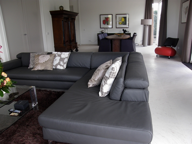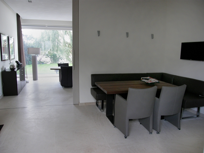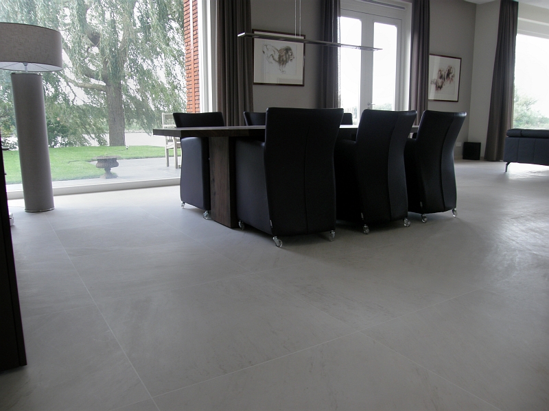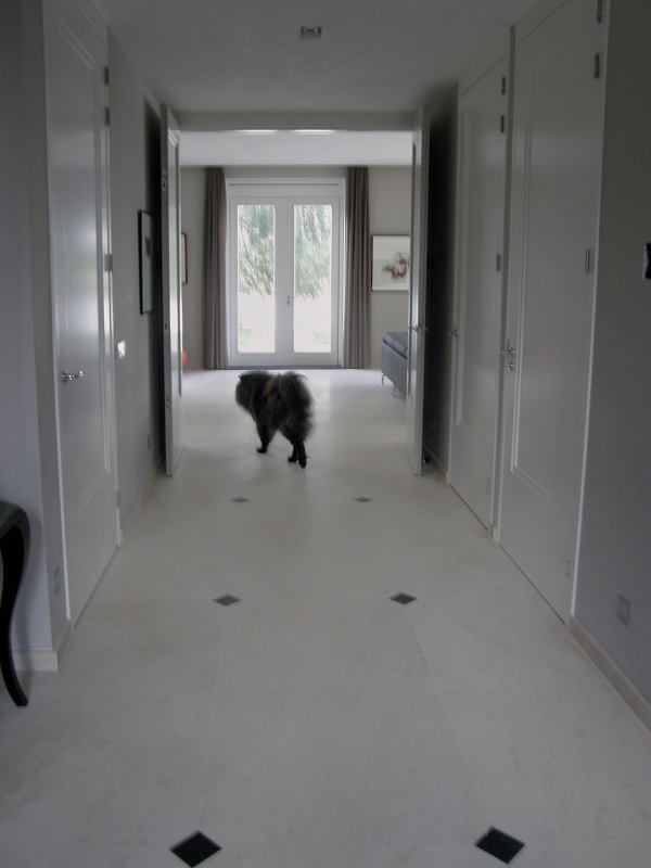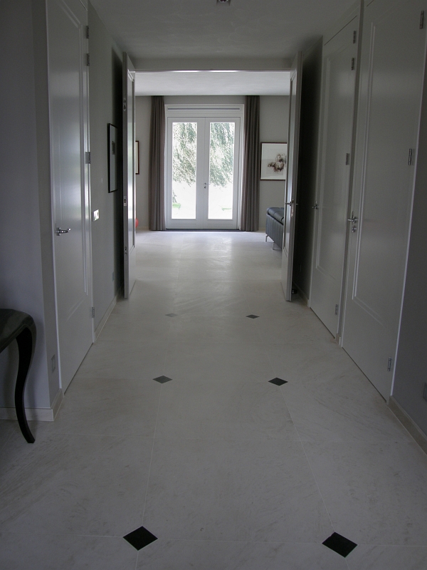 Residential house in Holland with bespoke floor tiles in limestone Mirabelle (or Mirabel) a Portuguese limestone from the Moleanos family. Moleanos is also known as Gascogne outside Portugal.