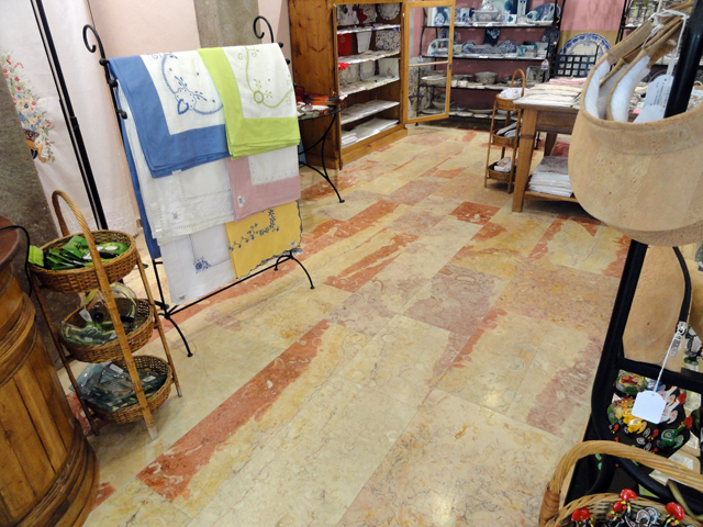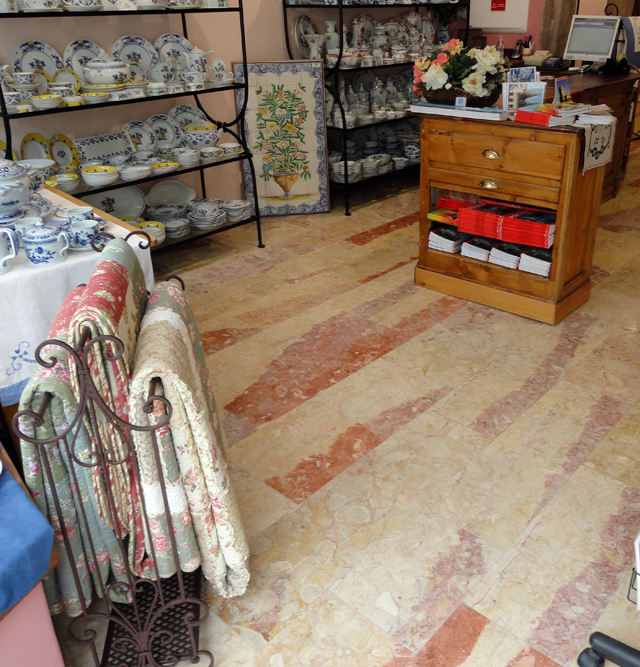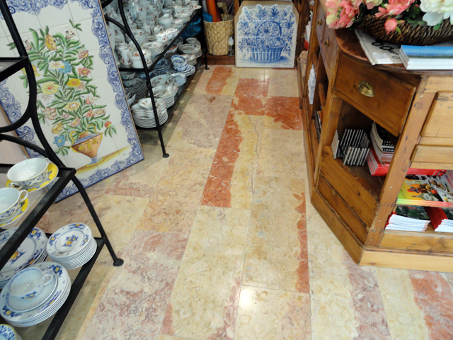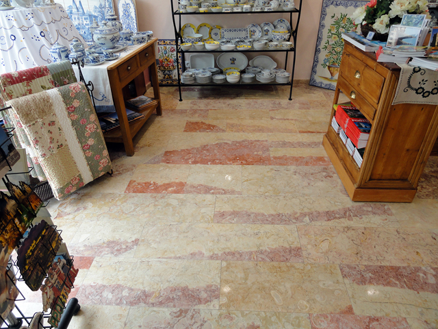 Floor tiles in Portuguese limestone Lioz Conventual, a hard limestone with a natural multicoloured “aged” look, Honed finish.