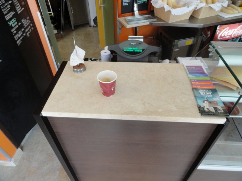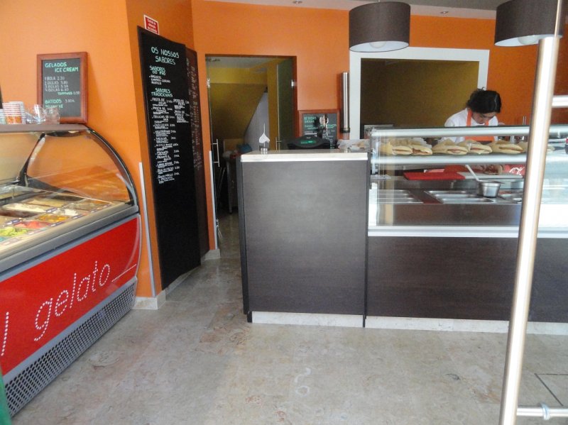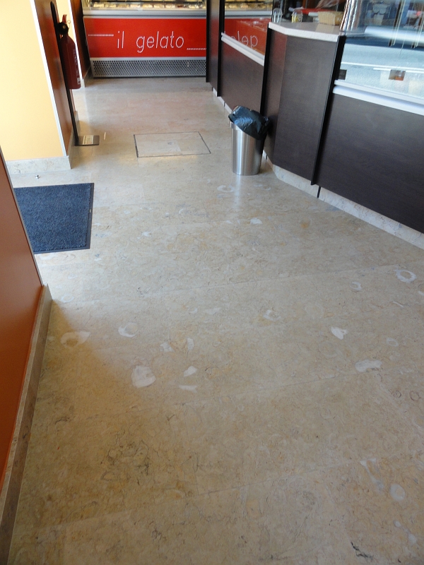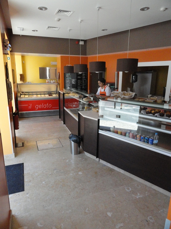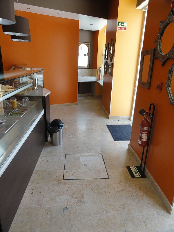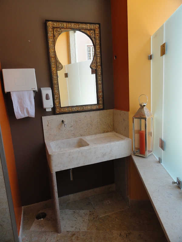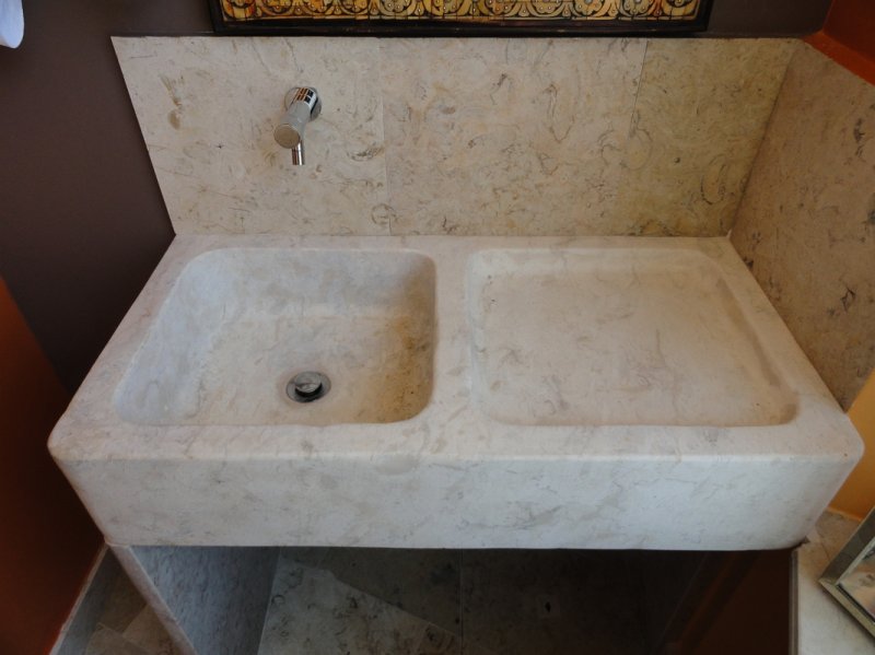 Project for a snack-bar in the old town of Sintra, Portugal. Sink, wall and floor tiles in Portuguese limestone Lioz Pero Pinheiro, a hard limestone with a natural look, Honed finish.
