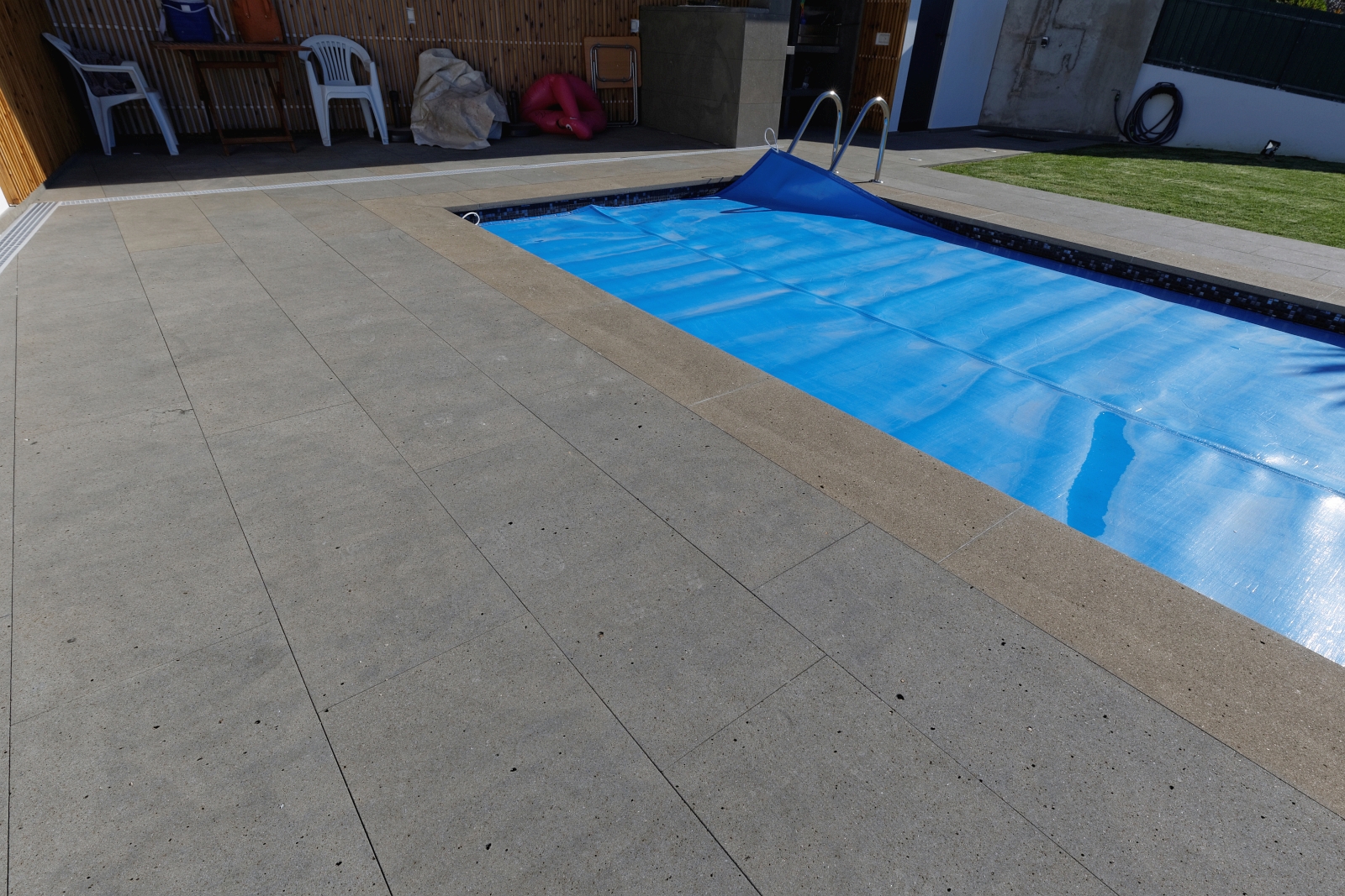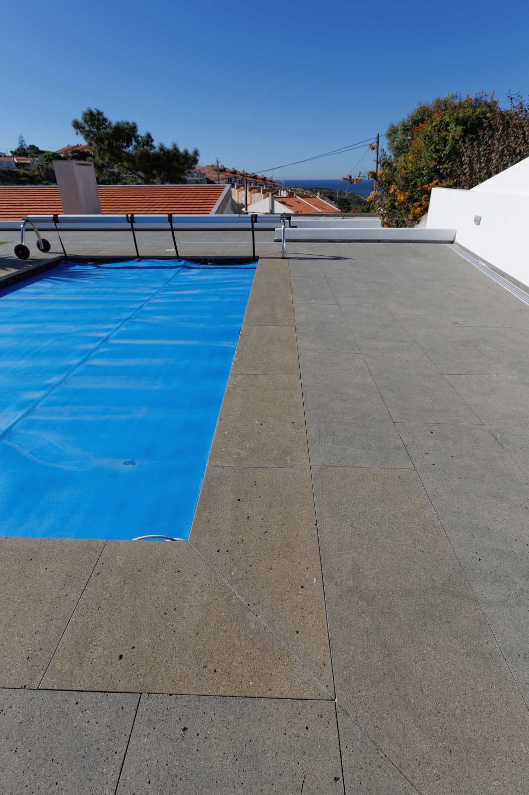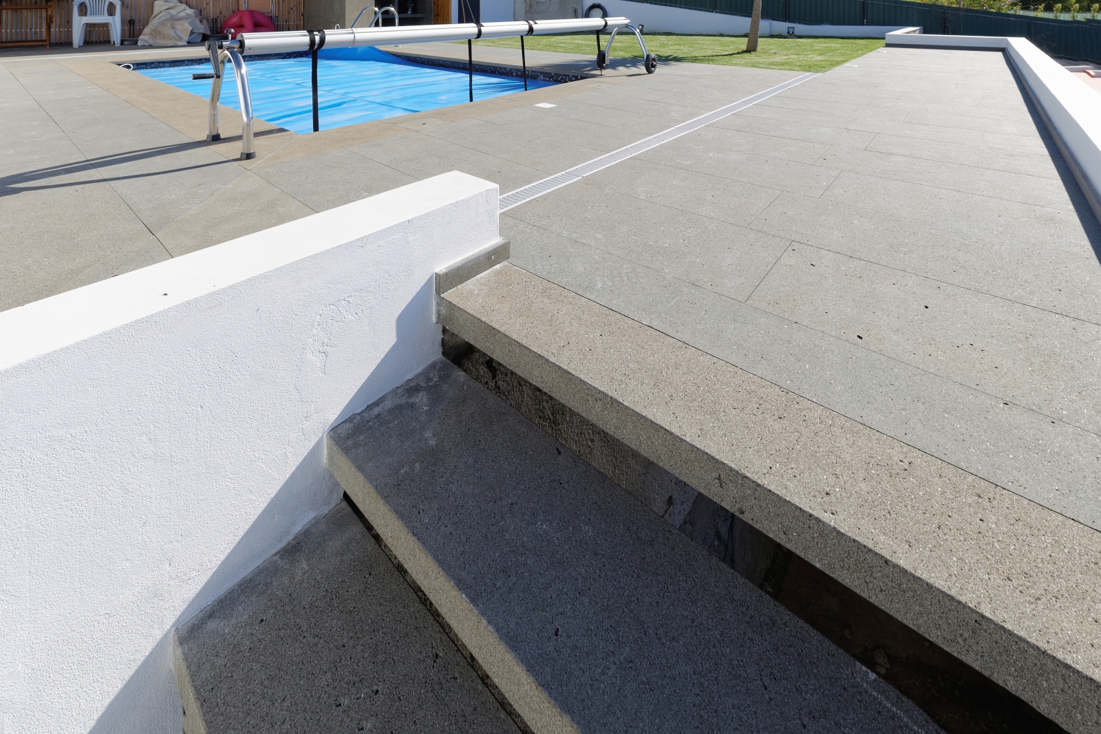 For this project of exterior swimming pool areas, we chose Portuguese Basalt for pavement, stairs, pool copings and barbecue in sawn and sandblasted finish.