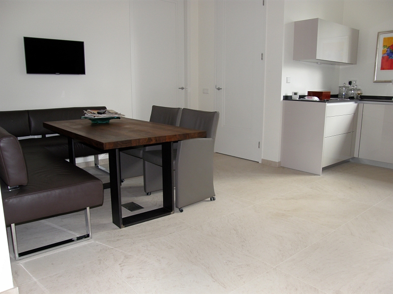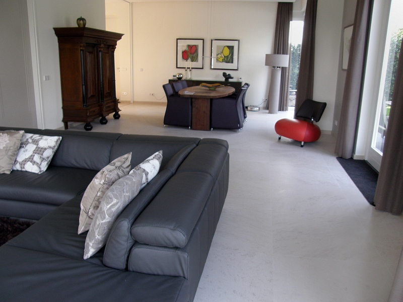 Residential house in Holland with bespoke floor tiles in limestone Mirabelle (or Mirabel) a Portuguese limestone from the Moleanos family. Moleanos is also known as Gascogne outside Portugal.