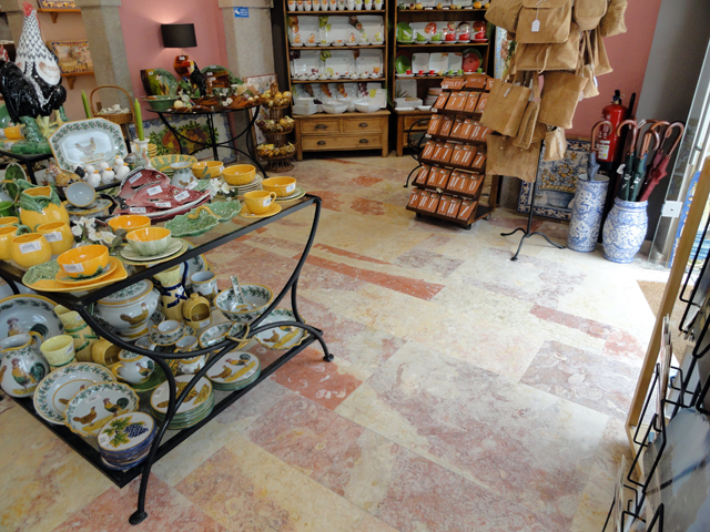 Floor tiles in Portuguese limestone Lioz Conventual, a hard limestone with a natural multicoloured “aged” look, Honed finish.