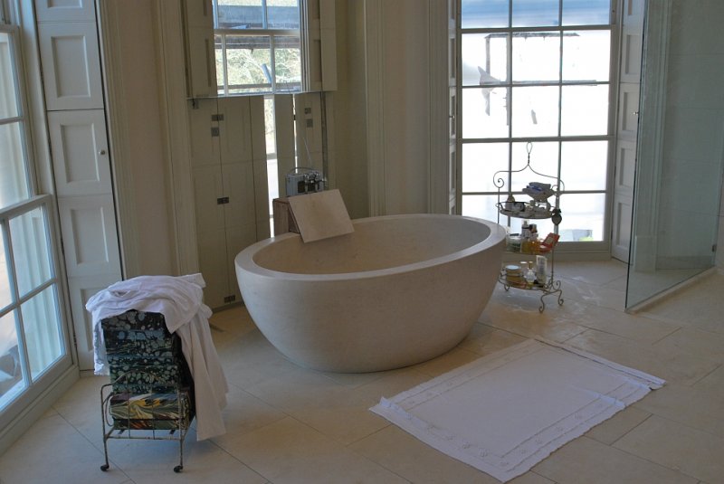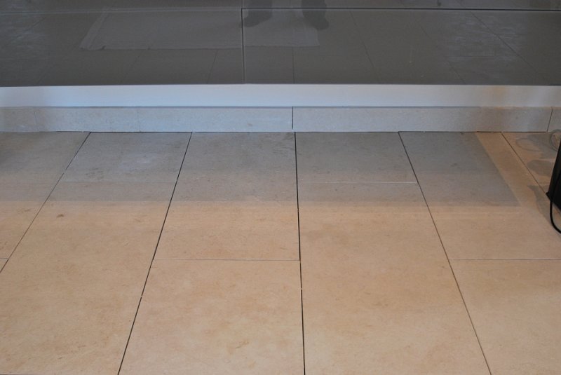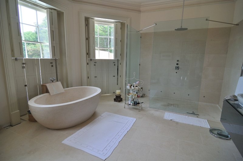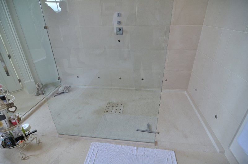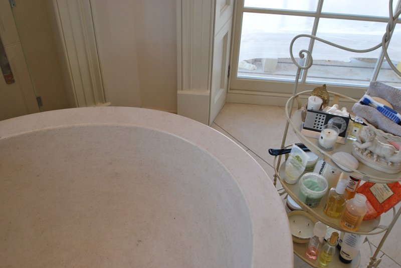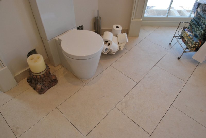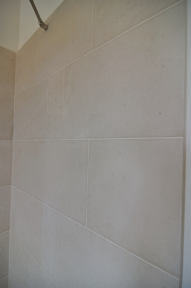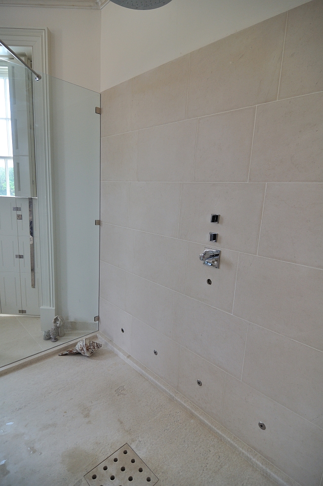 This project in Portuguese limestone Moleanos – also known as Gascogne outside Portugal – includes the floor tiles, wall tiles and single piece basin. This limestone, specially in this selection, doesn’t have a lot of speckles and it’s ideal for giving a special warmth look.